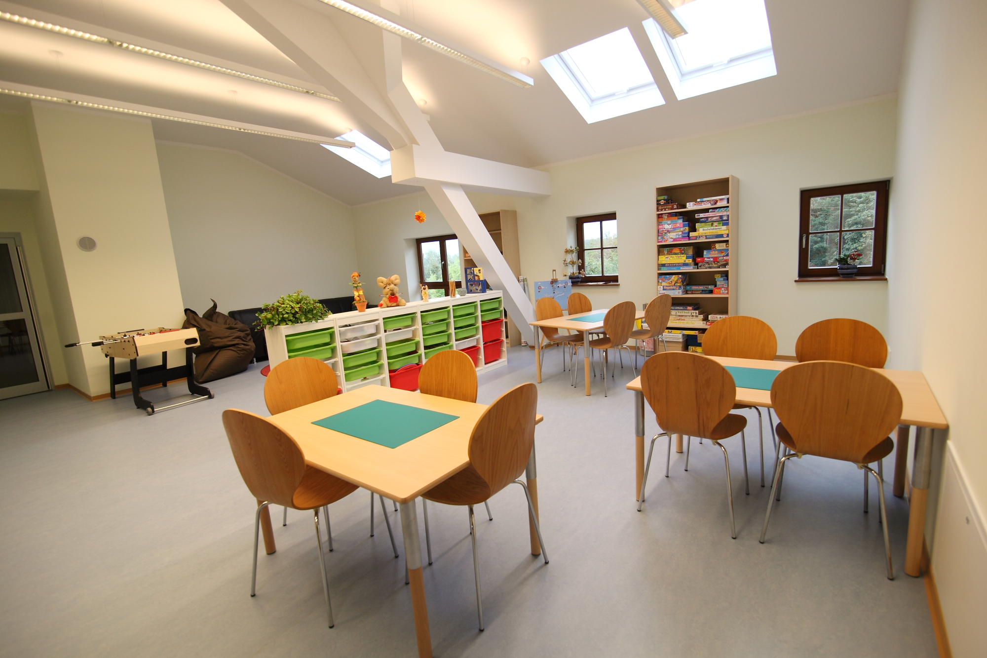 Nach dem Umbau des Gebäudes zur Kindertagesstätte sind neben drei Gruppenräumen für Krippenkinder, zwei Gruppenräume für die Kindergartenkinder und Nebenräume, wie ein Bewegungsraum etc. zur körperlichen Entfaltung der Kinder vorgesehen. In der oberen Ebene sind neben zwei Horträumen eine Kreativwerkstatt, eine Kuschel- und Leseecke, ein Experimentierraum sowie ein Theaterraum entstanden. Steigende Betreuungszahlen im Krippen-, Kindergarten- und Hortbereich bereits im ersten Quartal nach der Eröffnung sprechen für die Qualität des Projektes. Im Bedarfsfall können die jeweiligen Zahlen entsprechend der abzusichernden Betreuung angepasst werden.